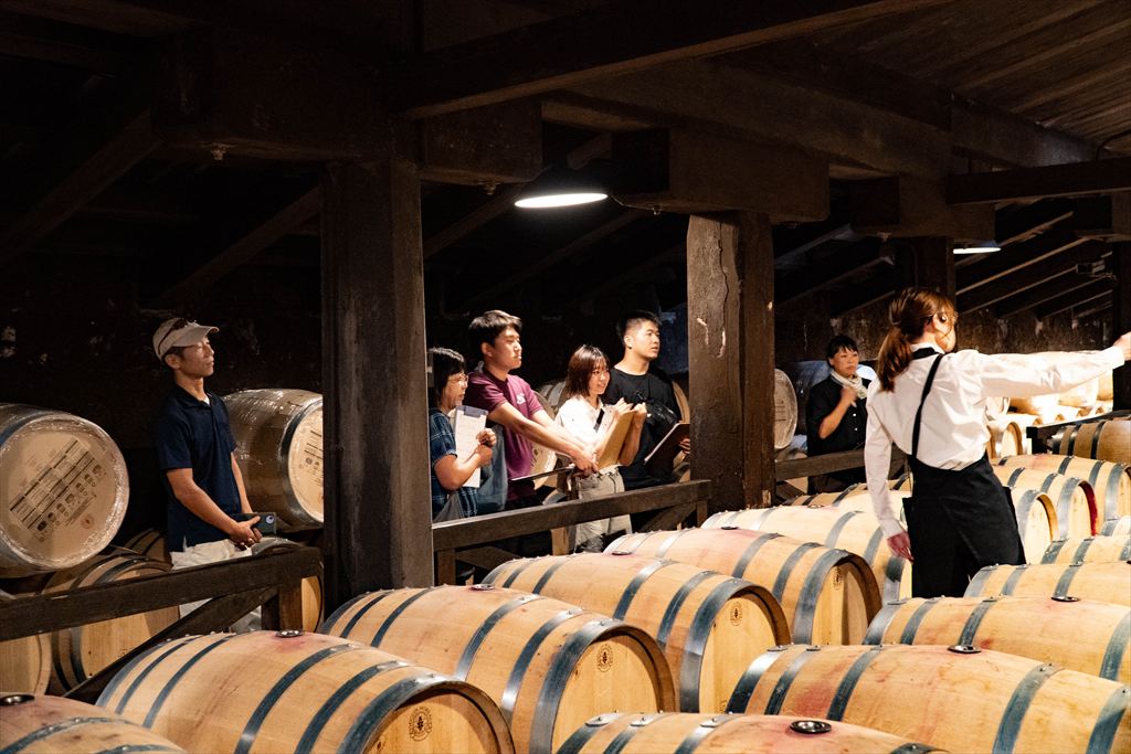 本館の建物の横には、1894年に建てられた 国の登録有形文化財にも指定されている第一号石蔵 が現存しています。今回はその4年後に建てられた第二号石蔵を見学させていただきました。現在は樽熟成庫として使用しており、中に入った瞬間、雪室でひやされた冷気で「ひんやり」。空気の冷たさと蔵の静けさ、そして時間の重みとともに熟成されるワインの香り。ワイン好きにはたまらない空間ですね。